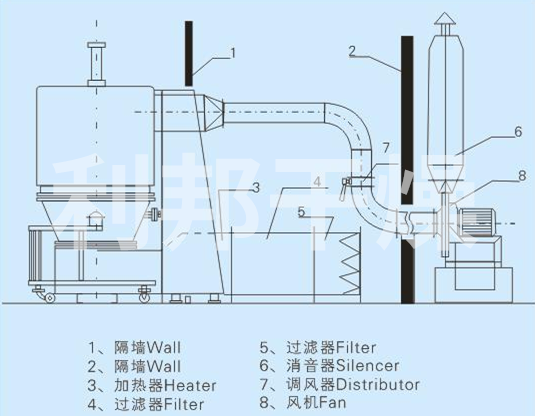 空氣經(jīng)加熱凈化后,由引風(fēng)機從下部導(dǎo)入,穿過料斗的孔洞板。在工作室內(nèi),經(jīng)攪拌和負壓作用形成流態(tài)化,水份快速蒸發(fā)后隨著排氣帶走,物料快速干燥。
