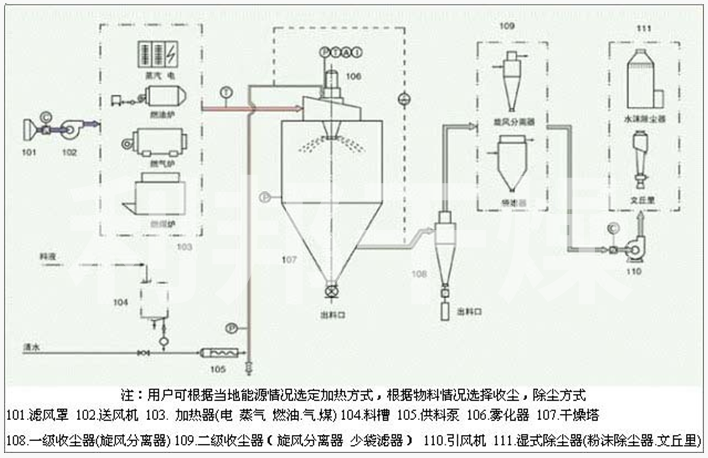 噴霧干燥機(jī)為開式循環(huán),并流式,離心式霧化。干燥介質(zhì)空氣經(jīng)過初、中效空氣過濾器過濾后根據(jù)操作指令由鼓風(fēng)機(jī)吸取再經(jīng)加熱器加熱通過高效過濾器的熱風(fēng)分配器進(jìn)入噴霧干燥主塔。液體物料根據(jù)操作指令經(jīng)過蠕動(dòng)泵,進(jìn)入高速旋轉(zhuǎn)的離心噴頭,在離心力作用下被分散成小霧滴。在噴霧干燥主塔內(nèi),小霧滴與熱風(fēng)在充分接觸,沿其特定路徑進(jìn)行熱交換后被干燥成為產(chǎn)品,然后通過旋風(fēng)分離器實(shí)現(xiàn)分離,固體物料被收集,氣體介質(zhì)再經(jīng)過過濾后被排出。整套噴霧系統(tǒng)易清潔、無死角,符合GMP要求。