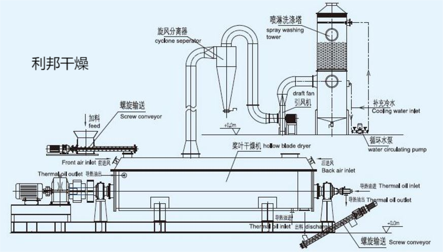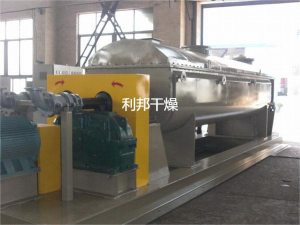 空心軸上密集排列著楔型中空漿葉,熱介質(zhì)經(jīng)空心軸流經(jīng)漿葉。單位有效容積內(nèi)傳熱面積很大,熱介質(zhì)溫度從-40℃到320℃,可以是水蒸汽,也可以是液體型:如熱水、導(dǎo)熱油等。間接傳導(dǎo)加熱,沒有攜帶空氣帶走熱量,熱量均用來加熱物料。熱量損失僅為通過器體保溫層向環(huán)境的散熱。楔型漿葉傳熱面具有自清潔功能。物料顆粒與楔型面的相對運(yùn)動產(chǎn)生洗刷作用,能夠洗刷掉楔型面上附著物料,使運(yùn)轉(zhuǎn)中一直保持著清潔的傳熱面。漿葉干燥機(jī)的殼體為Ω型,殼體內(nèi)一般安排二到四根空心攪拌軸。殼體有密封端蓋與上蓋,防止物料粉塵外泄而充分發(fā)揮作用。