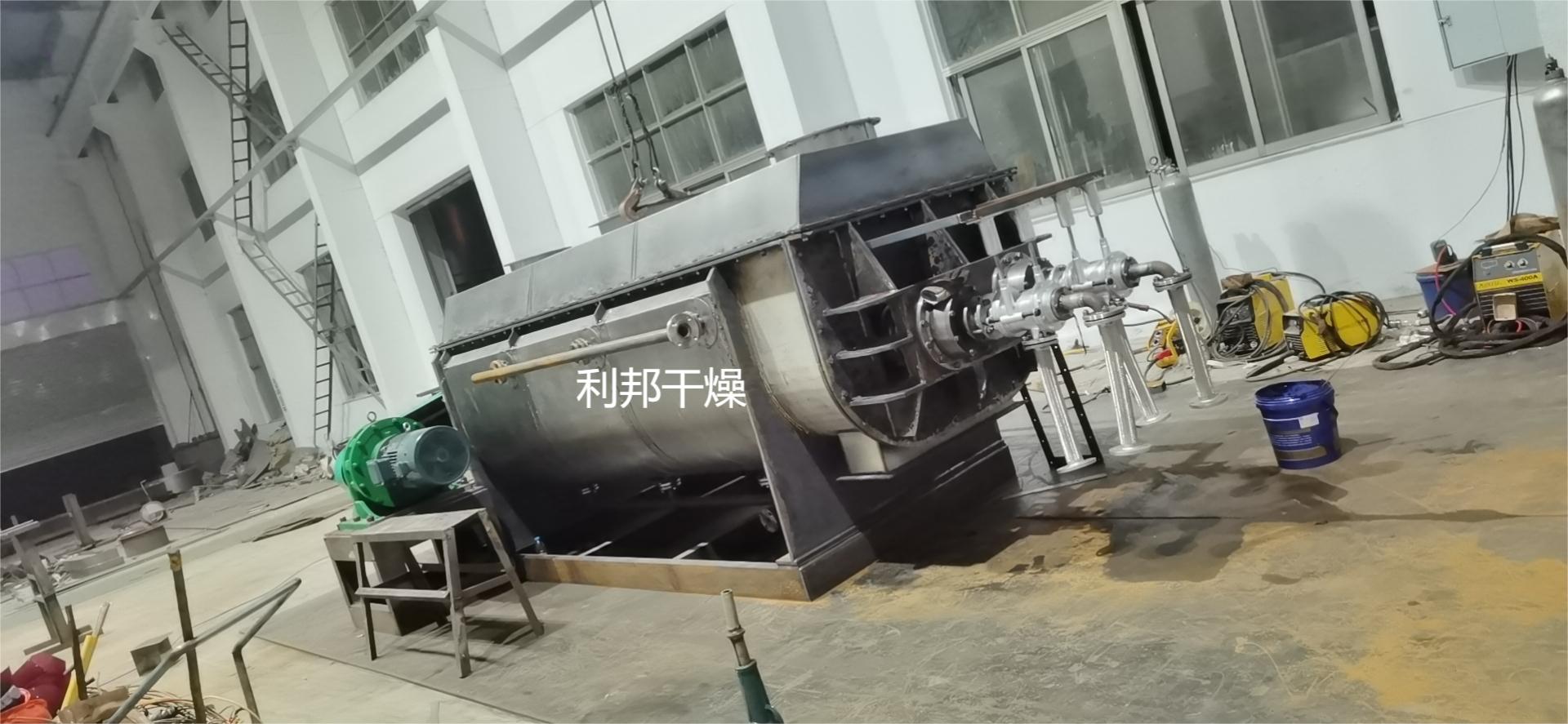 空心軸上密集排列著楔型中空漿葉,熱介質(zhì)經(jīng)空心軸流經(jīng)漿葉。單位有效容積內(nèi)傳熱面積很大,熱介質(zhì)溫度從-40℃到320℃,可以是水蒸汽,也可以是液體型:如熱水、導(dǎo)熱油等。間接傳導(dǎo)加熱,沒有攜帶空氣帶走熱量,熱量均用來加熱物料。熱量損失僅為通過器體保溫層向環(huán)境的散熱。楔型漿葉傳熱面具有自清潔功能。物料顆粒與楔型面的相對(duì)運(yùn)動(dòng)產(chǎn)生洗刷作用,能夠洗刷掉楔型面上附著物料,使運(yùn)轉(zhuǎn)中一直保持著清潔的傳熱面。漿葉干燥機(jī)的殼體為Ω型,殼體內(nèi)一般安排二到四根空心攪拌軸。殼體有密封端蓋與上蓋,防止物料粉塵外泄而充分發(fā)揮作用。