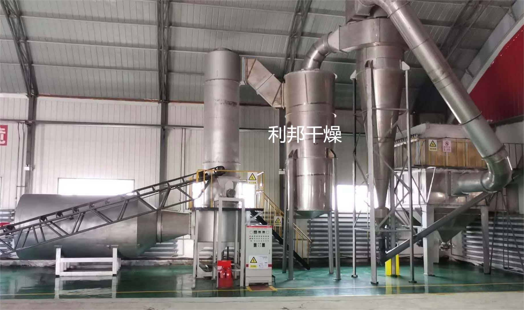 閃蒸干燥機(jī)是由熱空氣切線進(jìn)入干燥器底部,在攪拌器帶動下形成強(qiáng)有力的旋轉(zhuǎn)風(fēng)場。物料由螺旋加料器進(jìn)入干燥器內(nèi),在高速旋轉(zhuǎn)攪拌槳的強(qiáng)烈作用下,物料受撞擊、磨擦及剪切力的作用下得到分散,塊狀物料迅速粉碎,與熱空氣充分接觸、受熱、干燥。干燥好的物料被氣流攜帶進(jìn)入收塵系統(tǒng)進(jìn)行收集處理,符合環(huán)保要求含塵量《50mg/m3的尾氣由引風(fēng)機(jī)排空,完成整個干燥過程。