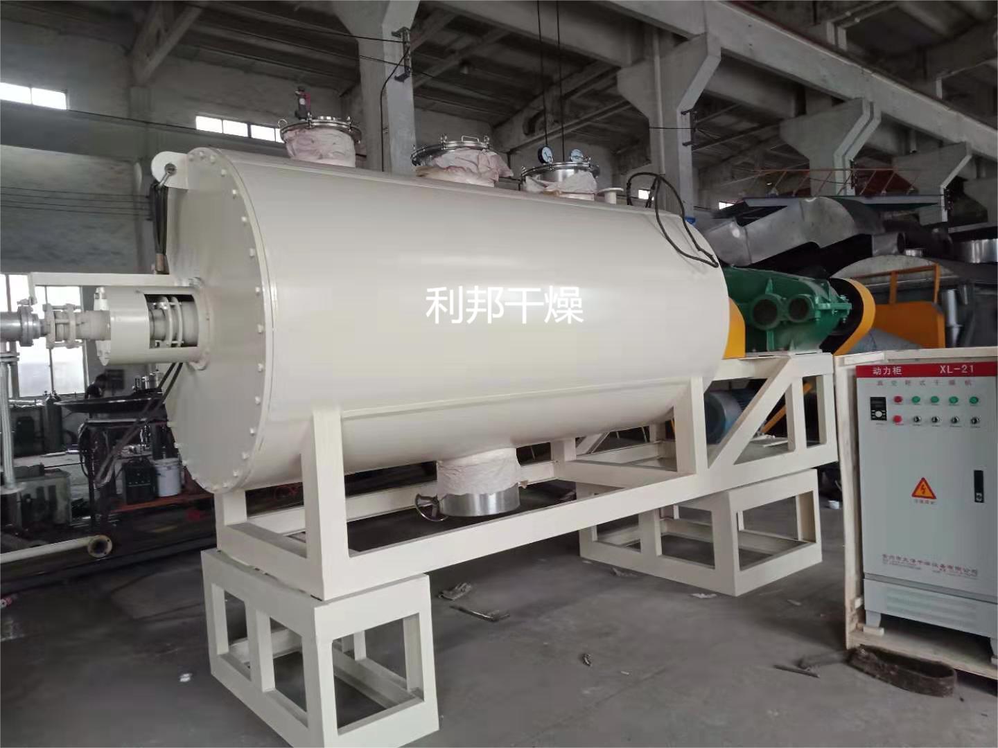 被干燥物料從殼體上方正中間加入,在不斷轉(zhuǎn)動的耙齒的攪拌下,物料與殼體壁接觸時,表面不斷更新,被干燥物料受到蒸汽間接加熱,而使物料水分氣化,氣化的水分由真空泵及時抽走,該機可同時采用夾層與耙齒同時加熱方式,傳熱面積更大,熱效率高,使其獲得更高的干燥效率。由于操作真空度較高,被干燥物料表面水蒸氣壓力遠(yuǎn)大于干燥機殼體內(nèi)蒸發(fā)空間的水蒸氣壓力,從而有利于被干燥物料內(nèi)部水分和表面水分的排出,有利于被干燥物料的水分子運動,達(dá)到干燥目的。