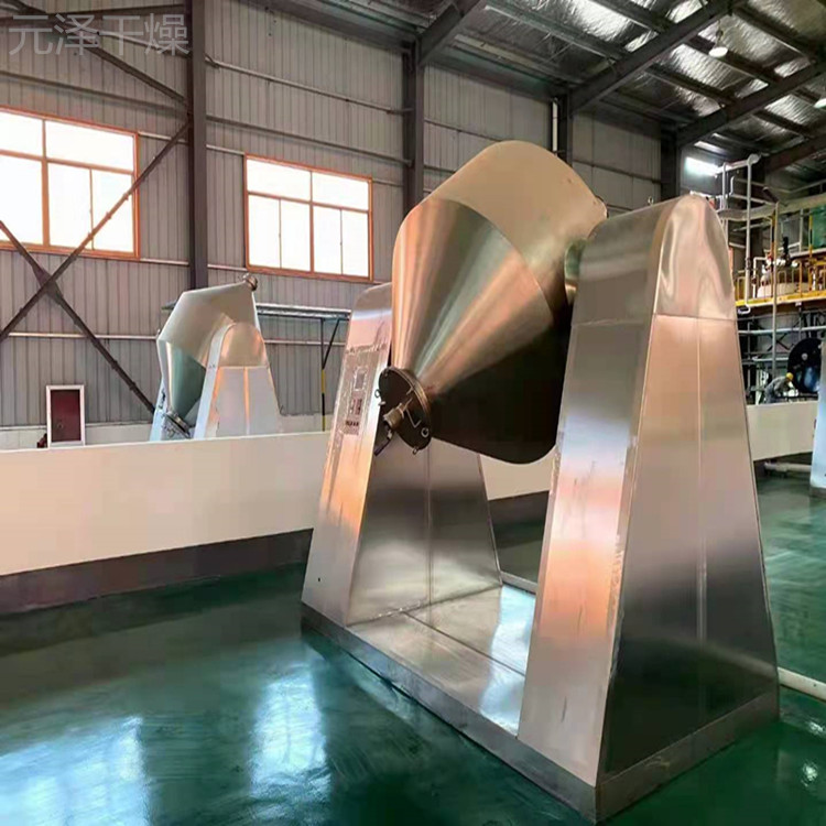 雙錐回轉(zhuǎn)真空干燥機(jī)為雙錐形的回轉(zhuǎn)罐體,罐內(nèi)在真空狀態(tài)下,向夾套內(nèi)通入蒸汽或熱水進(jìn)行加熱,熱量通過罐體內(nèi)壁與濕物料接觸,濕物料吸熱后蒸發(fā)的水汽,通過真空泵經(jīng)真空排氣管被抽走。由于罐體內(nèi)處于真空狀態(tài),且罐體的回轉(zhuǎn)使物料不斷的上下內(nèi)外翻動,故加快了物料的干燥速度,提高干燥效率,達(dá)到均勻干燥的目的。雙錐回轉(zhuǎn)真空干燥機(jī)系統(tǒng)主要由雙錐回轉(zhuǎn)真空干燥機(jī)、冷凝器、除塵器、真空抽氣系統(tǒng)、加熱系統(tǒng)、冷卻系統(tǒng)、電控系統(tǒng)等組成。