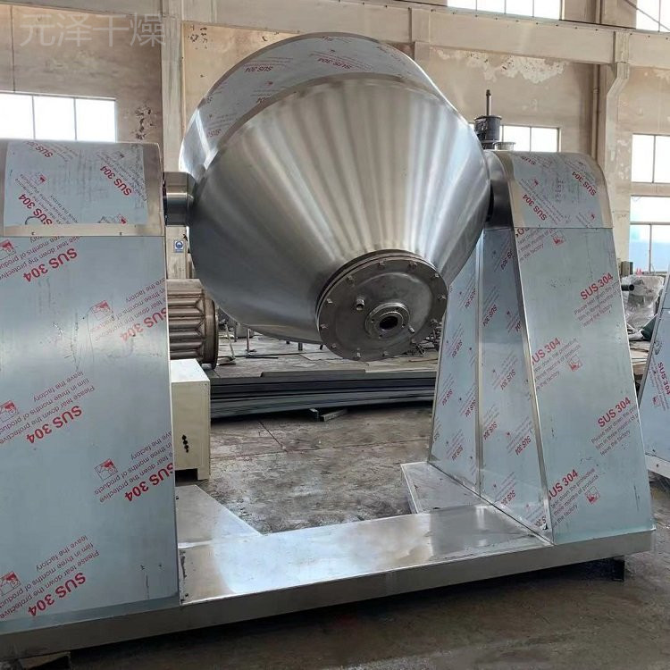 雙錐回轉(zhuǎn)真空干燥機(jī)為雙錐形的回轉(zhuǎn)罐體,罐內(nèi)在真空狀態(tài)下,向夾套內(nèi)通入蒸汽或熱水進(jìn)行加熱,熱量通過罐體內(nèi)壁與濕物料接觸,濕物料吸熱后蒸發(fā)的水汽,通過真空泵經(jīng)真空排氣管被抽走。由于罐體內(nèi)處于真空狀態(tài),且罐體的回轉(zhuǎn)使物料不斷的上下內(nèi)外翻動(dòng),故加快了物料的干燥速度,提高干燥效率,達(dá)到均勻干燥的目的。雙錐回轉(zhuǎn)真空干燥機(jī)系統(tǒng)主要由雙錐回轉(zhuǎn)真空干燥機(jī)、冷凝器、除塵器、真空抽氣系統(tǒng)、加熱系統(tǒng)、冷卻系統(tǒng)、電控系統(tǒng)等組成。