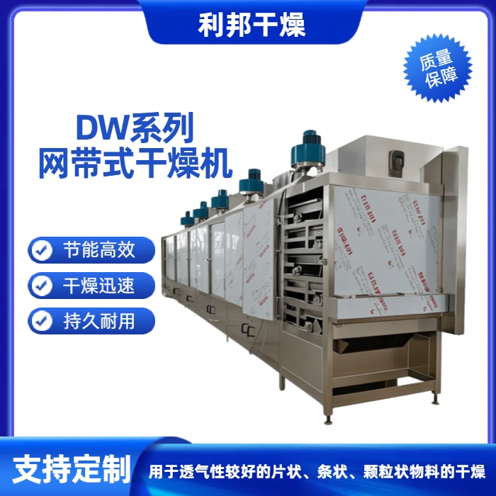 均勻干燥:物料平鋪在輸送帶上,熱風(fēng)穿透性好,干燥均勻。