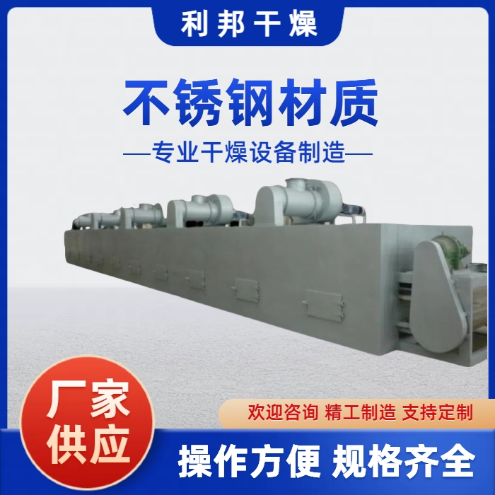 均勻干燥:物料平鋪在輸送帶上,熱風(fēng)穿透性好,干燥均勻。