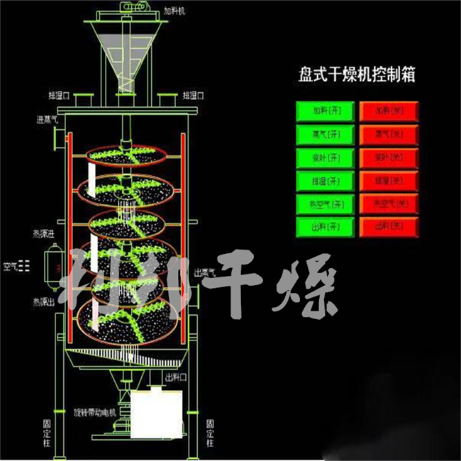 濕物料自加料器連續(xù)地加到干燥器上部層干燥盤上,帶有耙葉的耙臂作回轉(zhuǎn)運動使耙臂作回轉(zhuǎn)運動使耙葉連續(xù)地翻抄物料。物料沿指數(shù)螺旋線流過干燥盤表面,在小干燥盤上的物料被移送到外緣,并在外緣落到下方的大干燥盤外緣,在大干盤上物料向里移動并從中間落料口落如下一層小干燥盤中。大小干燥盤上下交替排列,物料得以連續(xù)地流過整個干燥器。中空的干燥盤內(nèi)通入加熱介質(zhì),加熱介質(zhì)形式有飽和蒸汽、熱水和導(dǎo)熱油,加熱介質(zhì)由干燥盤的一端進(jìn)入,從另一端導(dǎo)出。已干物料從后一層干燥盤落到殼體的底層,后被耙葉移送到出料口排出。濕份從物料中逸出,由設(shè)在頂蓋上的排濕口排出,真空型盤式干燥器的濕氣由設(shè)在頂蓋上的真空泵口排出。從底層排出的干物料可直接包裝。通過配加翅片加熱器、溶劑回收冷凝器、袋式除塵器、干料返混機(jī)構(gòu)、引風(fēng)機(jī)等輔機(jī),可提高其干燥的生產(chǎn)能力,干燥膏糊狀和熱敏性物 料,可方便地回收溶劑,并能進(jìn)行熱解和反應(yīng)操作。