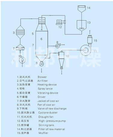 壓力噴霧干燥機(jī)工作過程為:料液通過隔膜泵高壓輸入,噴出霧狀液滴,然后同熱空氣并流下降,大部分粉粒由塔底排料口收集,廢氣及其微小粉末經(jīng)旋風(fēng)分離器分離,廢氣由抽風(fēng)機(jī)排出,粉末由設(shè)在旋風(fēng)分離器下的收粉筒收集,風(fēng)機(jī)出口處還可裝備二級(jí)除塵裝置,回收率在96%-98%。