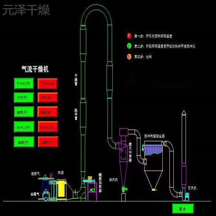 氣流干燥機是利用高速流動的熱氣流使?jié)竦矸蹜腋≡谄渲小>哂袀鳠嵯禂?shù)高,傳熱面積大,干燥時間短等特點。氣流干燥也稱"瞬間干燥"是固體流態(tài)化中稀相輸送在干燥方面的應用。該法是使加熱介質和待干燥固體顆粒直接接觸,并使待干燥固體顆粒懸浮于流體中,因而兩相接觸面積大,強化了傳熱傳質過程,廣泛用于散狀物料的干燥單元操作。